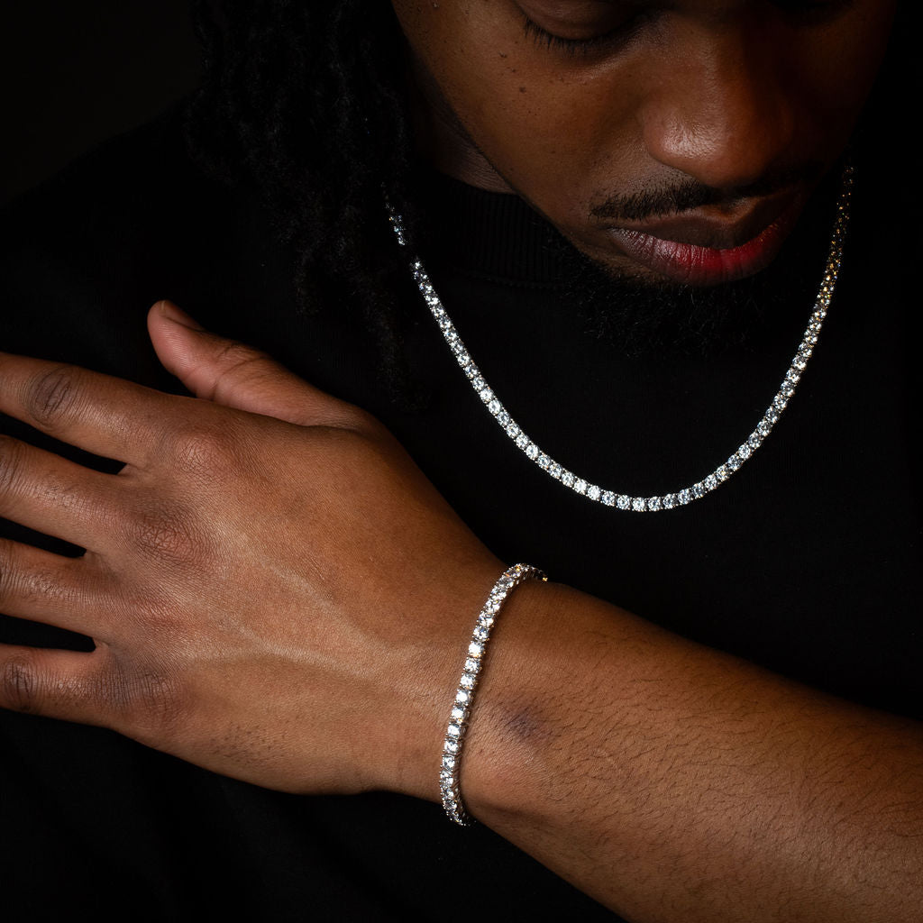 Classic tennis bracelet with 4mm round cut stones set end to end. Clean shine that works dressed up or casual—the kind of piece that upgrades any fit.